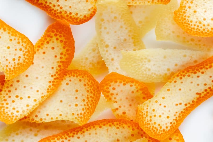 Je kunt vast en zeker een rijtje recepten opnoemen waarbij je citroenrasp door het gerecht snippert. De schil van de citroen bevat ontzettend veel aroma’s die extra smaakgeven. Verder is de schil rijk aan aan vitamine C, B6, vezels en antioxidanten. Omdat de structuur nogal taai is, kun je citroenschil beter in de blender meemixen. Schillen van niet-biologisch citrusfruit zijn geverfd om de vruchten er aantrekkelijker uit te laten zien. Dus wederom het advies: kies voor bio.