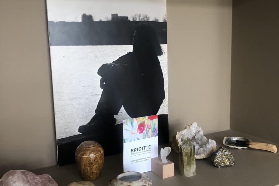 Een huisaltaar is een fysieke plek in huis waar je jouw dierbare dichtbij voelt. Het bestaat vaak uit concrete herinneringen zoals foto’s, sieraden en kaarten, aangevuld met symbolische elementen zoals edelstenen, een kaarsje en wierook. Een altaar zorgt voor extra verbinding omdat je er letterlijk en figuurlijk bij stil gaat staan. Kijk hier maar eens voor wat inspiratie.