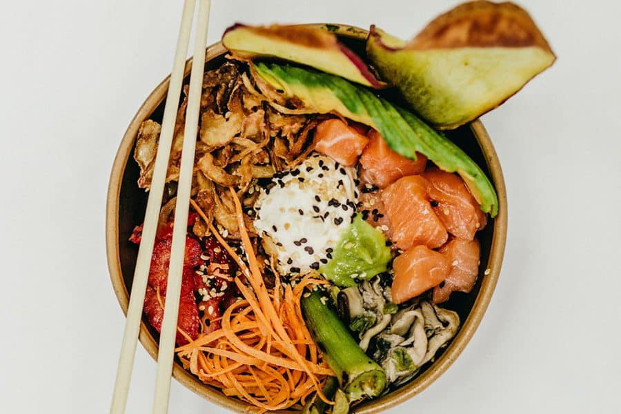 In de traditionele poké bowl zit meestal rauwe vis: zalm, tonijn of garnalen, gesneden in blokjes. Hoe verser, hoe beter natuurlijk! In plaats van vlees kun je ook stukjes gebakken kip of biefstuk gebruiken. Krijg je gasten op het eten die vegetariër zijn? Dan zijn tofu en tempeh geschikt.