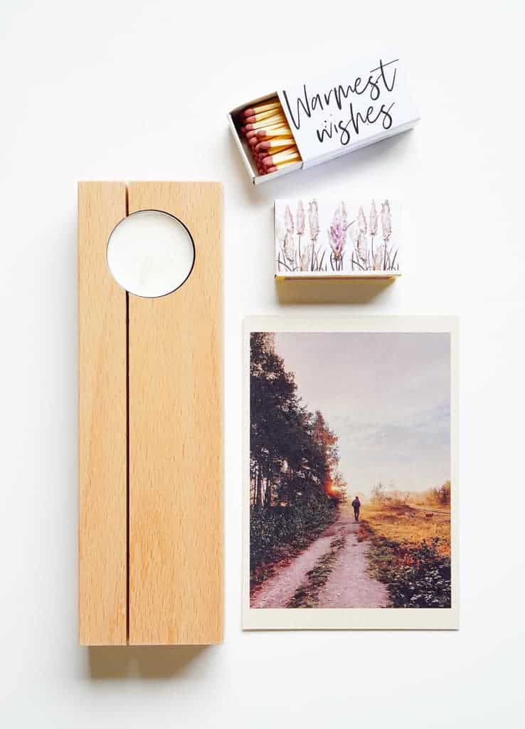 Het waxinelichtje van koolzaad- en sojawas is gemaakt door mensen met afstand tot de reguliere arbeidsmarkt. Ze zitten samen met een doosje lucifers en een mooie natuurkaart in een brievenbuspakketje.