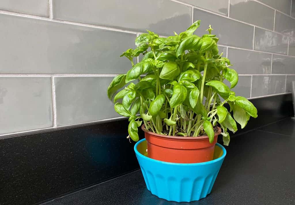 Een andere manier is door een schaaltje te vullen met water. Duik eens in je servieskast en kies een schaal waar de pot van het kruidenplantje stevig in kan blijven staan. Het kruid zal van onderuit het water op zuigen, zodat de bladeren groen en stevig blijven en het kruid langer vers blijft om aan je eten toe te kunnen voegen.