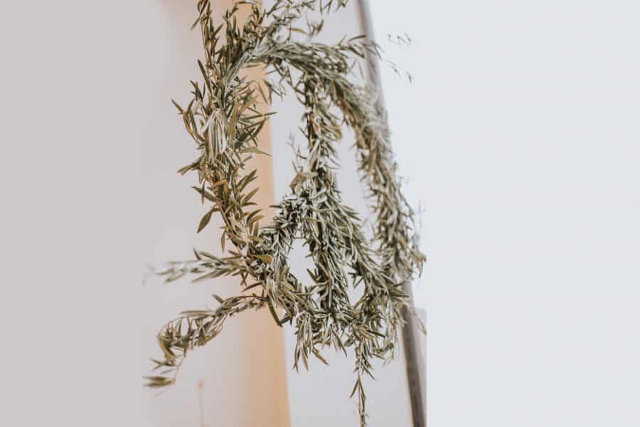 - Verbind de takjes rozemarijn aan elkaar met het touw totdat de cirkel rond is. Blijf rozemarijn toevoegen totdat je krans de gewenste dikte heeft.
