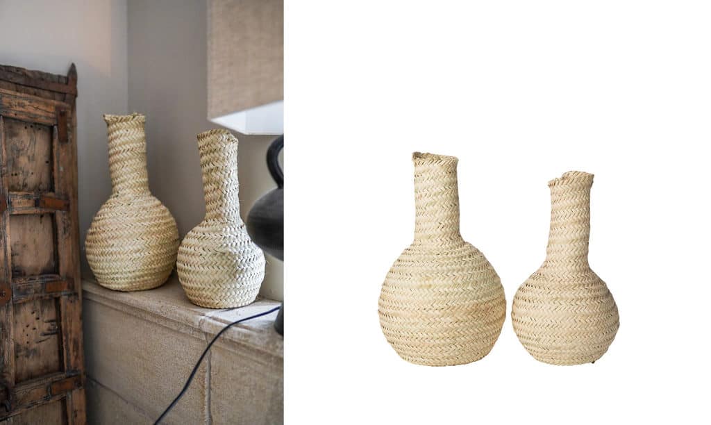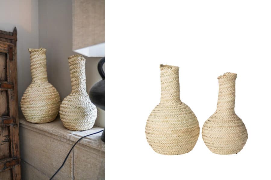 Deze handgevlochten vazen zijn door lokale vakmensen – artisans – in Marokko met de hand gemaakt van gedroogde palmbladeren. Door de natuurlijke uitstraling en neutrale kleur passen ze in elk interieur.