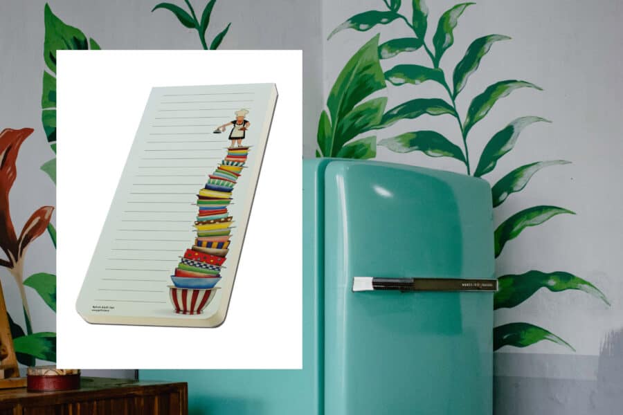 Zelfs een moedeloos stemmende afwas wordt een vrolijke aangelegenheid. Dit opschrijfboekje kan met een grote magneet zo aan de koelkast hangen.