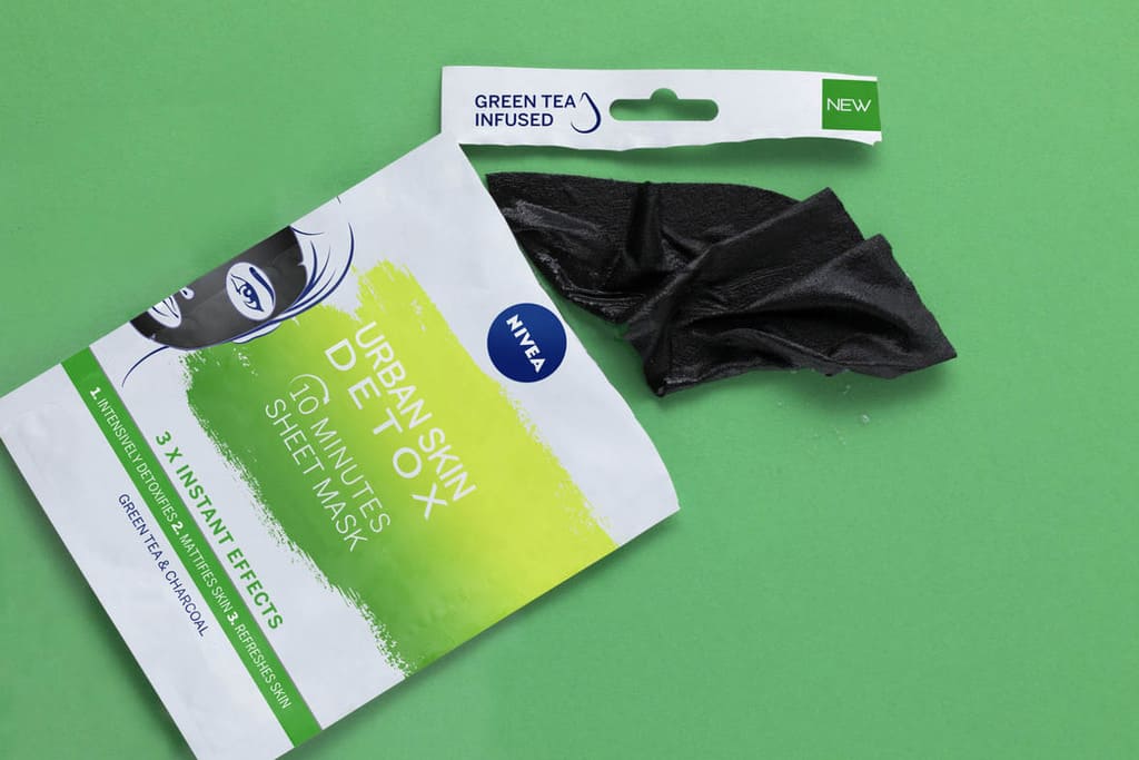 Dit tissuemasker met groene thee en houtskool kan zo op het gezicht worden gelegd. Bewaar het voor gebruik in de koelkast, dan biedt het extra afkoeling na een dagje in de zon.