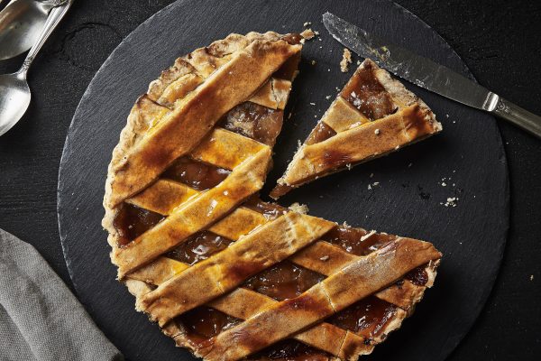 Rasp de schil van 1 citroen en pers er 3 uit. Laat 100 gram boter smelten in een pannetje op een laag pitje. Mix in een kom 2 eieren, 150 gram suiker, 150 gram amandelmeel, een snufje kaneel, drie eetlepels rum, de gesmolten boter, het citroensap en de citroenrasp stevig door elkaar. Giet alles bovenop het bladerdeeg in de taartvorm en laat in het midden van de voorverwarmde oven in zo’n 30 minuten gaar worden.