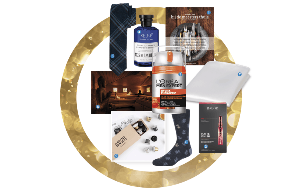Voor de man is er de Giftbox Goud Man met een waarde van €204,29 die je koopt voor €19,95. De box bevat: