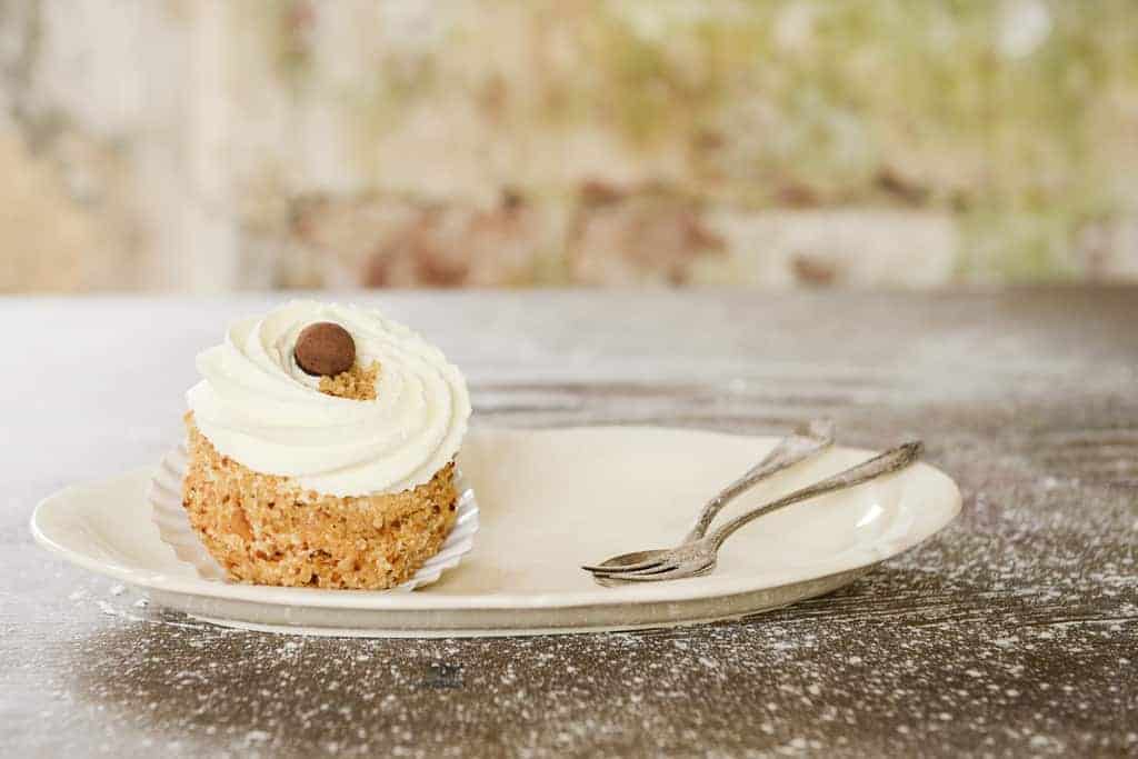 “Dat is een hazelnootschuimgebakje, ook wel bekend als progresgebak of een nougattaartje, er zijn verschillende benamingen voor. Ik houd van de klassieke versie, met minder suiker, niet te zoete slagroom en met zelf gebrande nougat van de beste hazelnootjes. Als je zo’n taartje gaat eten, valt het altijd een beetje uit elkaar. Niets lekkerder dan zo’n stukje schuim door de slagroom en langs de nougat halen. Om je vingers bij af te likken…” Het recept voor het progresgebak vind je hier.