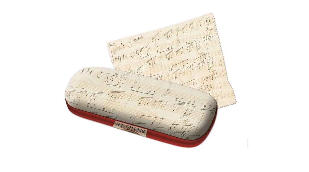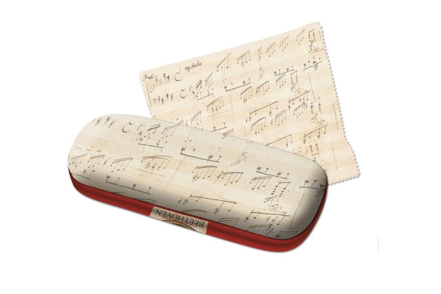 Aan de buitenkant is hij bedrukt met een stukje bladmuziek van de bekende ‘Mondscheinsonate’, de veertiende pianosonate van Beethoven. De sterke klapscharnier zorgt ervoor dat de bril niet gaat zwerven in een tas.