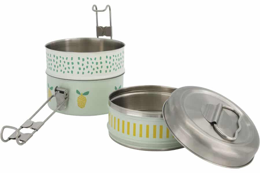 Deze vrolijke roestvrijstalen tiffin-lunchbox bestaat uit drie bakjes van verschillende hoogte, voor verschillende hapjes. De onderste twee bakjes zijn lekvrij. De box heeft twee stevige sluitclips en een deksel met handig hengsel. De bakjes zijn geschikt om gerechten op te warmen in de oven, maar niet in de magnetron.