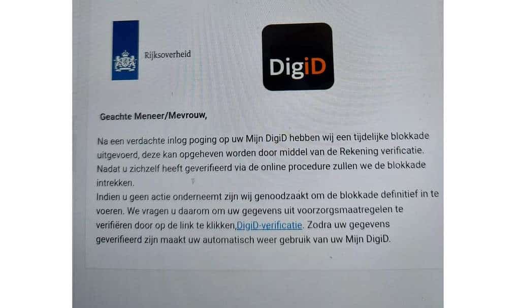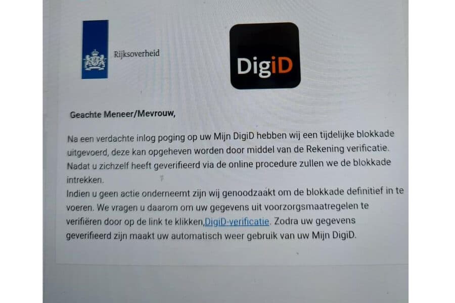 Hieronder zie je hoe de valse mail eruitziet. Het is een zogenaamd bericht van DigiD, waarin staat dat je account tijdelijk geblokkeerd is door een verdachte inlogpoging. Zodra je op de link klikt, kunnen de oplichters bij al je gegevens.