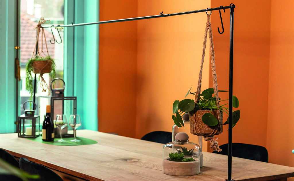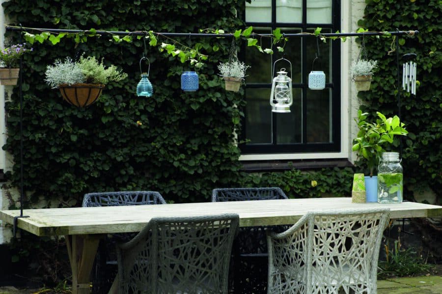 Aan de stang boven de tafel is plek voor bijvoorbeeld gekleurde lampionnetjes, kleine hangplantjes of minilantaarns. Of hang in het midden een grotere lamp, als een soort kroonluchter.
