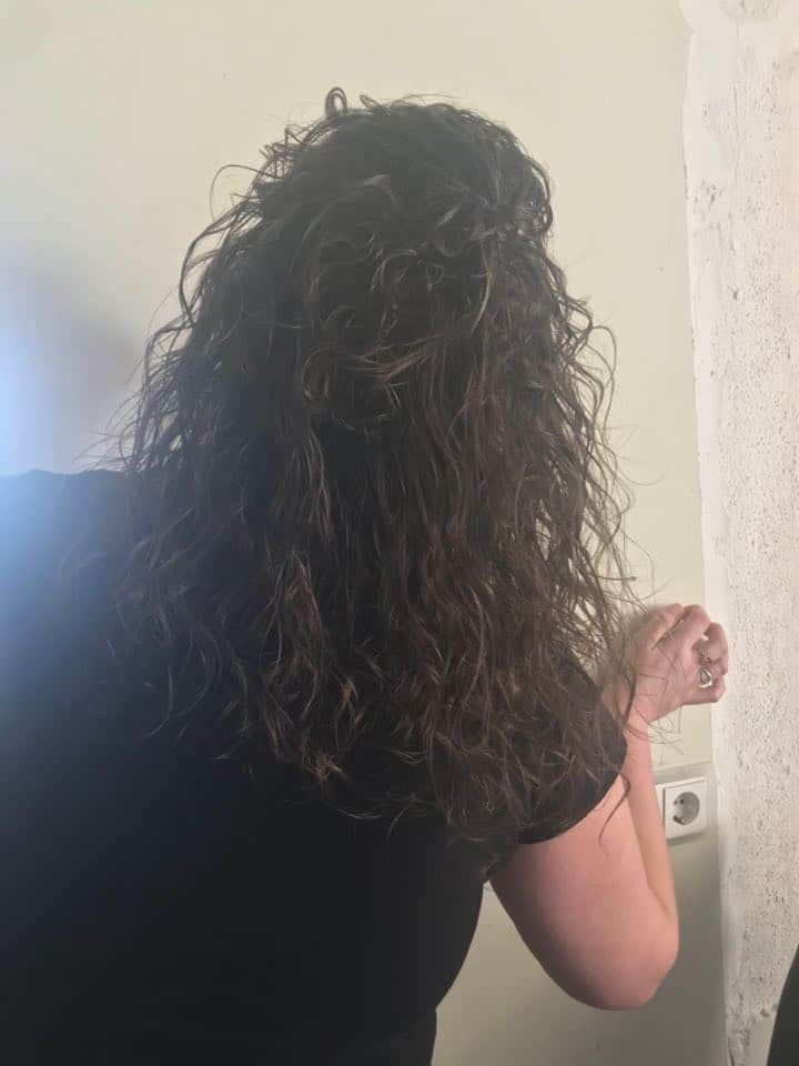 “De zwart-witfoto is van een aantal jaar terug. Ik waste toen met shampoo en borstelde mijn haar elke dag. Vaak in een staart of knot omdat het erg statisch en dun was. Sinds 2017 gebruik ik geen shampoo meer, maar één keer in de week een conditioner of een masker en haarproducten om geen pluizenbol te krijgen. Mijn haar is gezonder, bijna nooit meer vet. Ik heb alleen van de stress van werk en kids sinds de corona-periode nu wel last van haaruitval en het is doffer. Maar ik denk dat dat zelfs haarbreuk was geweest als ik nog wel met shampoo had gewassen. Ik heb het idee dat vooral de siliconen de boosdoeners zijn in vele shampoos. Voor mij nooit meer anders.”