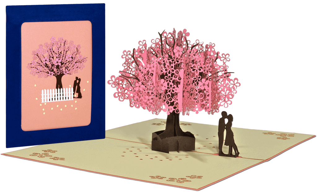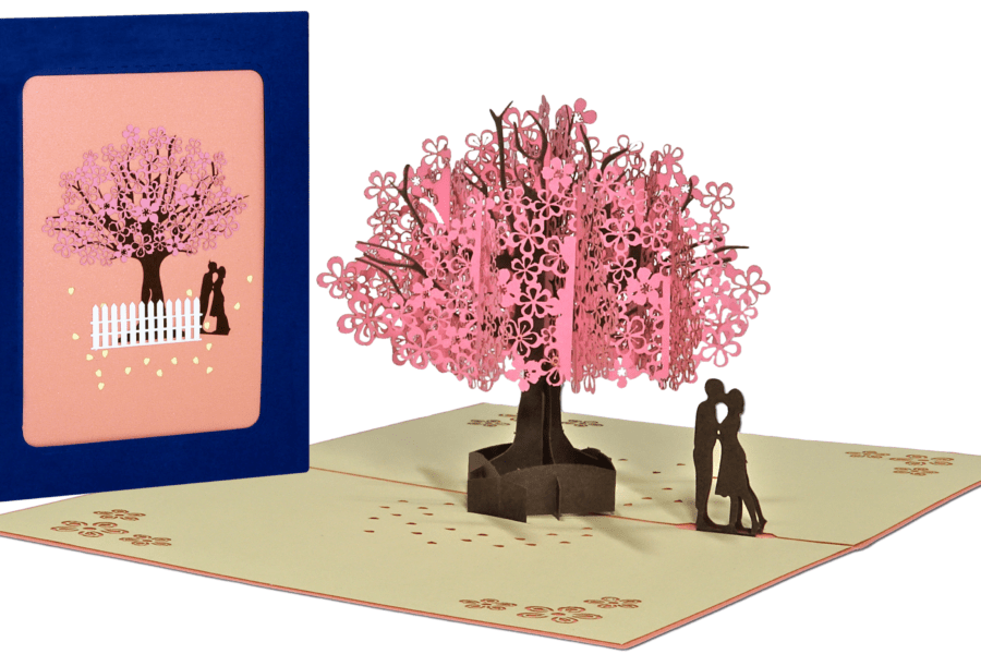 Door deze grote kaart open te vouwen komt de schitterende kersenboom tot leven, vol bloeiende roze bloesem (sakura in het Japans).