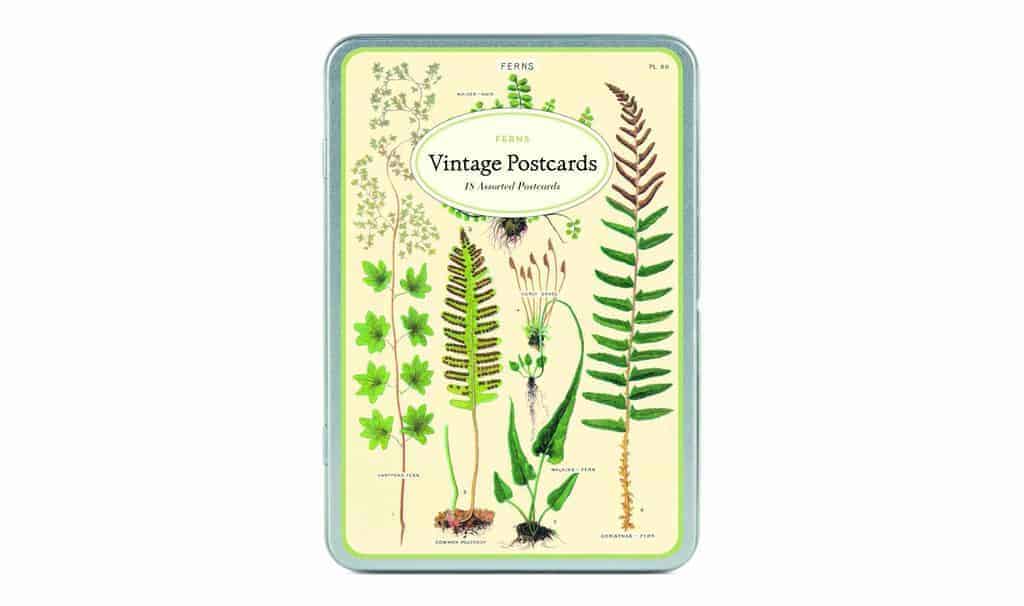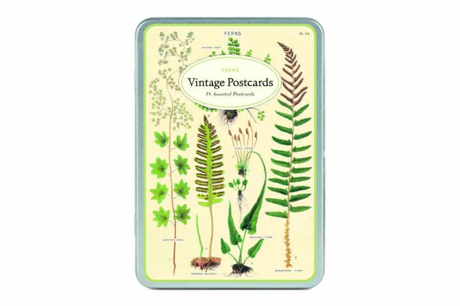 De achttien postkaarten met daarop prachtige vintage-illustraties van varens zijn opgeborgen in een fijn blik.