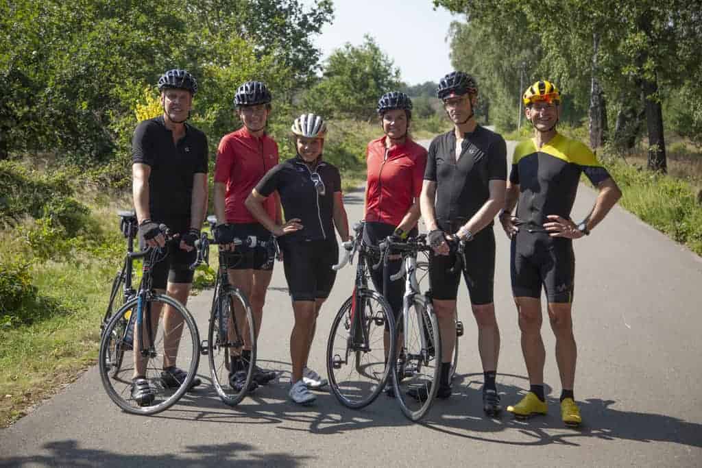 “Ze begonnen drie maanden geleden met een fysieke test. Vervolgens kregen ze trainingsschema’s en hadden we een aantal gezamenlijke en individuele trainingen. En via een groepsapp konden ze allerlei vragen stellen. Bijvoorbeeld wat je moet doen tegen zadelpijn. Zo droeg Remco een wielerbroek met een onderbroek eronder. Dan rijd je dus je billen kapot. Je moet alleen een wielerbroek dragen. Maar dan voelde hij zich zo naakt.”